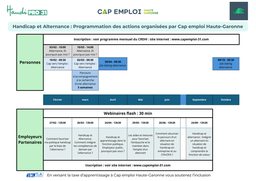 Tout au long de l’année, Cap emploi Haute-Garonne propose plusieurs actions pour permettre aux personnes de s’informer, se projeter et concrétiser un projet en alternance :