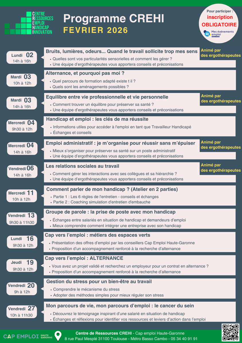 Le Centre de Ressources CREHI – Cap emploi Haute-Garonne poursuit son engagement en faveur de l’insertion professionnelle des personnes en situation de handicap avec un programme de février 2026 riche, innovant et résolument tourné vers les besoins concrets des bénéficiaires.